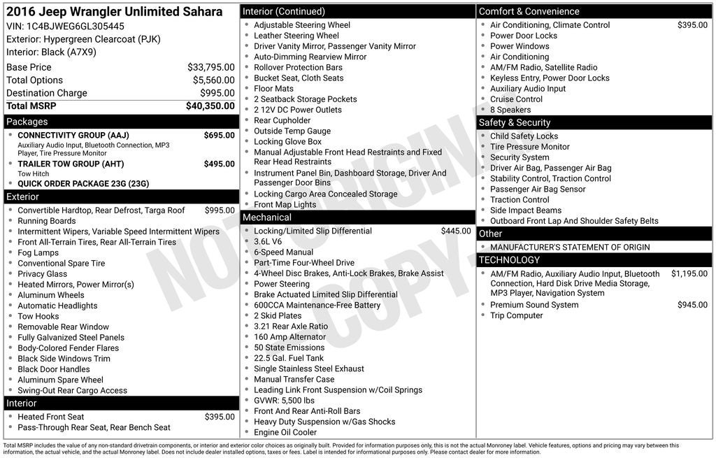 Body Color Appliques Front Bumper, Body Color Appliques Rear Bumper, Body Color/Accent Color Grille, Class II Receiver Hitch, Connectivity Group, GPS Navigation, Leather Wrapped Steering Wheel, Quick Order Package 23G, Remote USB Port, Tire Pressure Monitoring Display, Trailer Tow Group, Trailer Tow w/4-Pin Connector Wiring, Uconnect Voice Command w/Bluetooth®, Vehicle Information Center, 18 x 7.5 Polished Satin Carbon Wheels, 3.21 Rear Axle Ratio, 4-Wheel Disc Brakes, 40GB Hard Drive w/28GB Available, 5-Year SiriusXM Travel Link Service, 6.5 Touchscreen Display, 8 Speakers, ABS brakes, Air Conditioning, Air Conditioning w/Auto Temperature Control, Air Filtering, Alloy wheels, Alpine 9-Speaker w/All Weather Subwoofer, AM/FM radio: SiriusXM, Anti-Spin Differential Rear Axle, Audio Jack Input for Mobile Devices, Auto-dimming Rear-View mirror, Black 3-Piece Hard Top, Brake assist, CD player, Cloth Seats w/Adjustable Head Restraints, Compass, Driver door bin, Driver vanity mirror, Dual front impact airbags, Electronic Stability Control, Freedom Panel Storage Bag, Front anti-roll bar, Front Bucket Seats, Front Center Armrest w/Storage, Front fog lights, Front reading lights, Fully automatic headlights, Heated door mirrors, Heated Front Seats, Heavy Duty Suspension w/Gas Shocks, Humidity Sensor, Illuminated entry, Integrated roll-over protection, Leather steering wheel, Low tire pressure warning, Manufacturer's Statement of Origin, Occupant sensing airbag, Outside temperature display, Panic alarm, Passenger door bin, Passenger vanity mirror, Power door mirrors, Power steering, Power windows, Radio data system, Radio: 130, Radio: 430N, Rear anti-roll bar, Rear Window Defroster, Rear Window Wiper/Washer, Remote keyless entry, Security system, SiriusXM Travel Link, Speed control, Split folding rear seat, Steering wheel mounted audio controls, Sunrider Soft Top, Tachometer, Tilt steering wheel, Traction control, Trip computer, Variably intermittent wipers, Body Color Appliques Front Bumper, Body Color Appliques Rear Bumper, Body Color/Accent Color Grille, Class II Receiver Hitch, Connectivity Group, GPS Navigation, Leather Wrapped Steering Wheel, Quick Order Package 23G, Remote USB Port, Tire Pressure Monitoring Display, Trailer Tow Group, Trailer Tow w/4-Pin Connector Wiring, Uconnect Voice Command w/Bluetooth®, Vehicle Information Center.