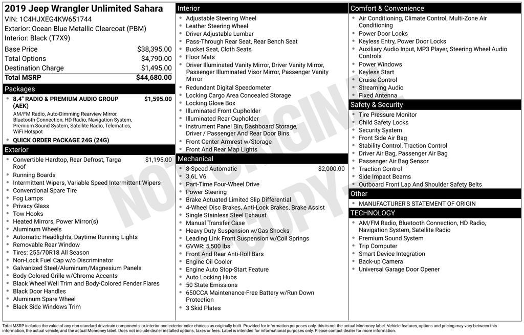 1-Year SiriusXM Guardian Trial, 4G LTE Wi-Fi Hot Spot, 5-Year SiriusXM Traffic Service, 5-Year SiriusXM Travel Link Service, 8.4 Radio & Premium Audio Group, 8.4 Touchscreen Display, Auto-Dimming Rear-View Mirror, Black 3-Piece Hard Top, Emergency/Assistance Call, For Details, Visit DriveUconnect.ca, Freedom Panel Storage Bag, GPS Navigation, HD Radio, No Soft Top, Quick Order Package 24G, Radio: Uconnect 4C Nav w/8.4 Display, Rear Window Defroster, Rear Window Wiper/Washer, SiriusXM Traffic Plus, SiriusXM Travel Link, 3.45 Rear Axle Ratio, 4-Wheel Disc Brakes, 8 Speakers, ABS brakes, Air Conditioning, Alloy wheels, Alpine Premium Audio System, AM/FM radio: SiriusXM, Apple CarPlay/Android Auto, Automatic temperature control, Brake assist, Cloth Low-Back Bucket Seats, Compass, Delay-off headlights, Driver door bin, Driver vanity mirror, Dual front impact airbags, Dual front side impact airbags, Electronic Stability Control, Front anti-roll bar, Front Bucket Seats, Front Center Armrest w/Storage, Front dual zone A/C, Front fog lights, Front reading lights, Fully automatic headlights, Garage door transmitter, Heated door mirrors, Heavy Duty Suspension w/Gas Shocks, Illuminated entry, Integrated roll-over protection, Leather steering wheel, Low tire pressure warning, Manufacturer's Statement of Origin (DISC), Non-Lock Fuel Cap w/o Discriminator, Occupant sensing airbag, Outside temperature display, Panic alarm, ParkView Rear Back-Up Camera, Passenger door bin, Passenger vanity mirror, Power door mirrors, Power steering, Power windows, Radio data system, Radio: Uconnect 4 w/7 Display, Rear anti-roll bar, Rear reading lights, Remote keyless entry, Security system, Speed control, Split folding rear seat, Steering wheel mounted audio controls, Tachometer, Telescoping steering wheel, Tilt steering wheel, Traction control, Trip computer, Variably intermittent wipers, Voltmeter, Wheels: 18 x 7.5 Polished w/Gray Spokes, 1-Year SiriusXM Guardian Trial, 4G LTE Wi-Fi Hot Spot, 5-Year SiriusXM Traffic Service, 5-Year SiriusXM Travel Link Service, 8.4 Radio & Premium Audio Group, 8.4 Touchscreen Display, Auto-Dimming Rear-View Mirror, Black 3-Piece Hard Top, Emergency/Assistance Call, For Details, Visit DriveUconnect.ca, Freedom Panel Storage Bag, GPS Navigation, HD Radio, No Soft Top, Quick Order Package 24G, Radio: Uconnect 4C Nav w/8.4 Display, Rear Window Defroster, Rear Window Wiper/Washer, SiriusXM Traffic Plus, SiriusXM Travel Link.