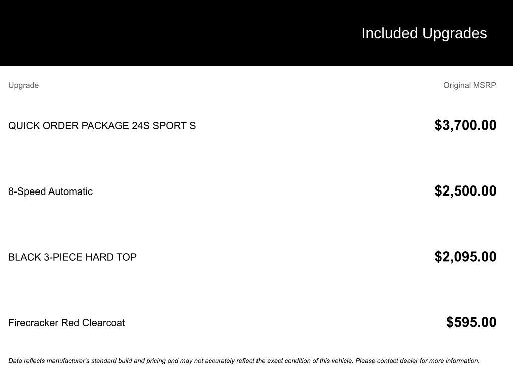 Apple CarPlay, Apple CarPlay/Android Auto, Automatic Headlamps, Deep Tint Sunscreen Windows, Front 1-Touch Down Power Windows, Normal Duty Plus Suspension, ParkView Rear Back-Up Camera, Power Heated Mirrors, Power Tailgate Lock, Premium Wrapped Steering Wheel, Quick Order Package 24S Sport S, Radio: Uconnect 4 w/7 Display, Remote Keyless Entry, Security Alarm, Speed Sensitive Power Locks, Sport S, Sun Visors w/Illuminated Vanity Mirrors, Wheels: 17 x 7.5 Tech Silver Aluminum, 3.73 Rear Axle Ratio, 4-Wheel Disc Brakes, 4G LTE Wi-Fi Hot Spot, 8 Speakers, ABS brakes, Air Conditioning, AM/FM radio, Black 3-Piece Hard Top, Brake assist, Cloth Low-Back Bucket Seats, Compass, Delay-off headlights, Driver door bin, Driver vanity mirror, Dual front impact airbags, Dual front side impact airbags, Electronic Stability Control, Emergency communication system, Front anti-roll bar, Front Bucket Seats, Front Center Armrest w/Storage, Front fog lights, Front License Plate Bracket, Front reading lights, Google Android Auto, GPS Antenna Input, Integrated Center Stack Radio, Integrated roll-over protection, Integrated Voice Command w/Bluetooth®, Low tire pressure warning, Normal Duty Suspension, Occupant sensing airbag, Outside temperature display, Passenger door bin, Passenger vanity mirror, Power steering, Radio data system, Rear anti-roll bar, Rear reading lights, Speed control, Split folding rear seat, Steering wheel mounted audio controls, Tachometer, Telescoping steering wheel, Tilt steering wheel, Traction control, Trip computer, USB Host Flip, Variably intermittent wipers, Wheels: 17 x 7.5 Black Steel Styled, Wheels: 17 x 7.5 Tech Silver Aluminum (DISC), Apple CarPlay, Apple CarPlay/Android Auto, Automatic Headlamps, Deep Tint Sunscreen Windows, Front 1-Touch Down Power Windows, Normal Duty Plus Suspension, ParkView Rear Back-Up Camera, Power Heated Mirrors, Power Tailgate Lock, Premium Wrapped Steering Wheel, Quick Order Package 24S Sport S, Radio: Uconnect 4 w/7 Display, Remote Keyless Entry, Security Alarm, Speed Sensitive Power Locks, Sport S, Sun Visors w/Illuminated Vanity Mirrors, Wheels: 17 x 7.5 Tech Silver Aluminum.