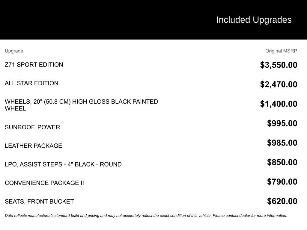 10-Speed Automatic, 4WD, Black Leather, 10-Way Power Driver Seat Adjuster w/Lumbar, 120-Volt Bed Mounted Power Outlet, 120-Volt Interior Power Outlet, 170 Amp Alternator, 2-Speed Electronic Shift Transfer Case, 4-Way Manual Driver Seat Adjuster, 4 Round Black Assist Steps (LPO), All Star Edition, Animated LED Projector Headlamps, Auto-Dimming Inside Rear-View Mirror, Bed View Camera w/2 Trailer Camera Provisions, Black Chevytec Spray-On Bedliner, Black Mirror Caps, Bluetooth® For Phone, Body-Color Front Bumper, Body-Color Rear Bumper, Chevrolet Connected Access Capable, Cloth Rear Seat w/Storage Package, Color-Keyed Carpeting Floor Covering, Compass, Convenience Package, Convenience Package II, Deep-Tinted Glass, Dual Rear USB Ports (Charge Only), Dual-Zone Automatic Climate Control, Electric Rear-Window Defogger, Electronic Cruise Control w/Set & Resume Speed, EZ Lift Power Lock & Release Tailgate, Front LED Fog Lamps, Front Rubberized Vinyl Floor Mats, Gloss Black Door Handles, Halogen Reflector Headlamps, HD Rear Vision Camera, HD Surround Vision, Heat Package, Heated & Auto-Dimming Vertical Trailering Mirrors, Heated Driver & Front Outboard Passenger Seating, Heated Steering Wheel, Heated Vertical Trailering Mirrors, High Gloss Black Mirror Caps, Hill Descent Control, Hitch Guidance w/Hitch View, In-Vehicle Trailering App System, Keyless Open & Start, Leather Package, LED Cargo Area Lighting, LED Taillamps w/Signature, Manual Tilt & Telescoping Steering Column, Manual Tilt-Wheel Steering Column, Off-Road Suspension, OnStar & Chevrolet Connected Services Capable, Power Door Locks, Power Front Windows w/Driver Express Up/Down, Power Front Windows w/Passenger Express Down, Power Rear Windows w/Express Down, Power Sliding Rear Window w/Defogger, Power Sunroof, Preferred Equipment Group 1LT, Push Button Start, Rear 60/40 Folding Bench Seat (Folds Up), Rear Cross Traffic Alert, Rear Park Assist, Rear Rubberized Vinyl Floor Mats, Remote Start Package, Remote Vehicle Starter System, Safety Package, SiriusXM w/360L, Standard Tailgate, Steering Wheel Audio Controls, Suspension Package, Trailer Camera Provisions, Trailer Side Blind Zone Alert, Unauthorized Entry Theft-Deterrent System, Universal Home Remote, Up-Level Rear Seat w/Storage Package, Wheels: 18 High Gloss Black Aluminum, Wi-Fi Hotspot Capable, Wireless Phone Projection, Wrapped Steering Wheel, Z71 Off-Road Package, Z71 Sport Edition, 120-Volt Interior Power Outlet (DISC), 17 Machined Aluminum Wheels, 2 Charge/Data USB Ports Inside Center Console, 3.73 Rear Axle Ratio, 4-Wheel Disc Brakes, 6 Speakers, 6-Speaker Audio System, 720 Cold-Cranking Amps Heavy-Duty Battery, ABS brakes, Adaptive Cruise Control, Air Conditioning, Alloy wheels, AM/FM radio: SiriusXM with 360L, Apple CarPlay/Android Auto, Auto High-beam Headlights, Brake assist, Bumpers: chrome, Cloth Seat Trim, Delay-off headlights, Driver door bin, Driver vanity mirror, Dual front impact airbags, Dual front side impact airbags, Durabed Pickup Bed, Electronic Stability Control, Floor-Mounted Center Console, Front 40/20/40 Split-Bench Seats w/Lockable Storage, Front anti-roll bar, Front Bucket Seats, Front Center Armrest w/Storage, Front License Plate Kit, Front reading lights, Front wheel independent suspension, Fully automatic headlights, Gloss Black Front Bumper, Gloss Black Rear Bumper, Heated door mirrors, Illuminated entry, LED Smoked Amber Roof Marker Lamps, LED Taillamps w/Fixed Signature, Low tire pressure warning, Occupant sensing airbag, Outside temperature display, Overhead airbag, Overhead console, Panic alarm, Passenger door bin, Passenger vanity mirror, Power door mirrors, Power steering, Power windows, Premium audio system: Chevrolet Infotainment 3 Premium, Pwr Up/Down Tailgate Function w/Pwr Lock & Release, Radio: Chevrolet Infotainment 3 Premium System, Rear reading lights, Rear step bumper, Rear Wheelhouse Liners