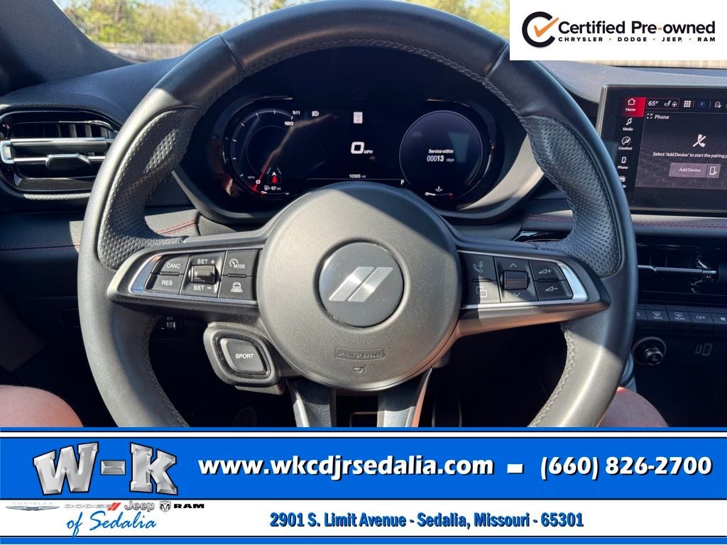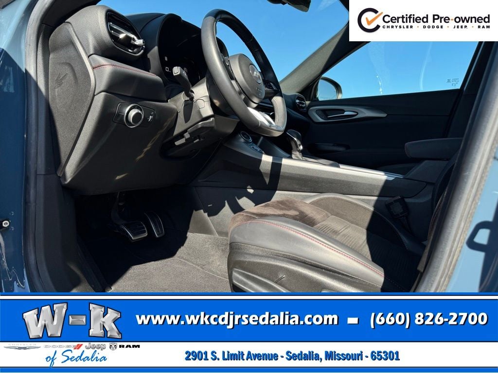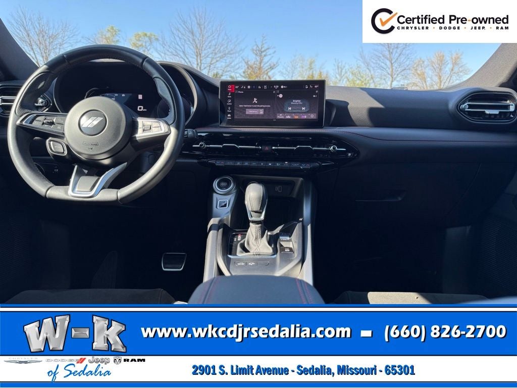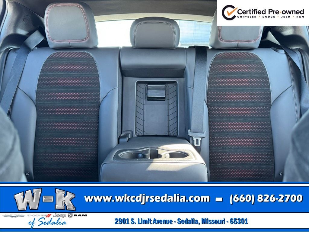 Certified Pre-Owned Gold Certified, Alcantara Seats w/Red Accents, Bright Pedals, Cold Weather Group, Dark GT Badge, Dark Hornet Badge, Dual Mode Suspension, Gloss Black Painted Day Light Opening, Gloss Black Painted Mirror Caps, GT Blacktop + Track Pack Bundle, Heated Front Seats, Heated Steering Wheel, Manual Adjust 6-Way Driver Seat, Manual Adjust 6-Way Front Passenger Seat, Quick Order Package 23M (DISC), Red Brake Calipers, Remote Start System, Sporty Leather Steering Wheel, Steel Door Sills, Wheels: 20 x 8 Abyss Finish Aluminum, 10.25 Touchscreen Display, 4-Wheel Disc Brakes, 6 Speakers, ABS brakes, Air Conditioning, Alloy wheels, AM/FM radio: SiriusXM, Anti-whiplash front head restraints, Apple CarPlay, Apple CarPlay/Android Auto, Auto High-beam Headlights, Brake assist, Bumpers: body-color, Cloth/Leatherette Seats, Compass, Connectivity - US/Canada, Delay-off headlights, Disassociated Touchscreen Display, Driver door bin, Driver vanity mirror, Dual front impact airbags, Dual front side impact airbags, Electronic Stability Control, Emergency communication system: Dodge Connect, Four wheel independent suspension, Front anti-roll bar, Front Bucket Seats, Front Center Armrest w/Storage, Front dual zone A/C, Front reading lights, Fully automatic headlights, Google Android Auto, GPS Antenna Input, Heated door mirrors, Illuminated entry, Integrated Center Stack Radio, Knee airbag, Lane Departure Warning System, Leather steering wheel, Low tire pressure warning, Manufacturer's Statement of Origin, Normal Duty Suspension, Occupant sensing airbag, Outside temperature display, Overhead airbag, Overhead console, Panic alarm, ParkView Rear Back-Up Camera, Passenger door bin, Passenger vanity mirror, Power door mirrors, Power steering, Power windows, Radio: Uconnect 5 w/10.25 Display, Rain sensing wipers, Rear anti-roll bar, Rear seat center armrest, Rear window defroster, Rear window wiper, Remote keyless entry, Security system, Speed control, Speed-sensing steering, Split folding rear seat, Spoiler, Tachometer, TBD Axle Ratio, Telescoping steering wheel, Tilt steering wheel, Traction control, Trip computer, Turn signal indicator mirrors, Variably intermittent wipers, Wheels: 17 x 7 Silver Aluminum, Alcantara Seats w/Red Accents, Bright Pedals, Cold Weather Group, Dark GT Badge, Dark Hornet Badge, Dual Mode Suspension, Gloss Black Painted Day Light Opening, Gloss Black Painted Mirror Caps, GT Blacktop + Track Pack Bundle, Heated Front Seats, Heated Steering Wheel, Manual Adjust 6-Way Driver Seat, Manual Adjust 6-Way Front Passenger Seat, Quick Order Package 23M (DISC), Red Brake Calipers, Remote Start System, Sporty Leather Steering Wheel, Steel Door Sills, Wheels: 20