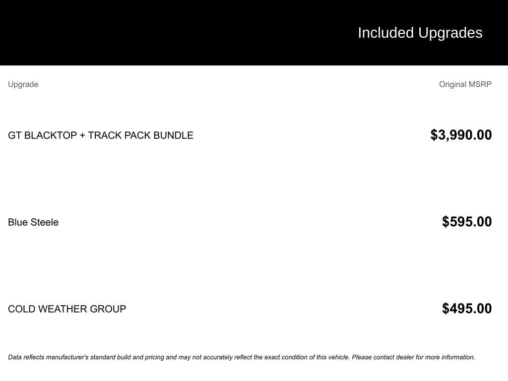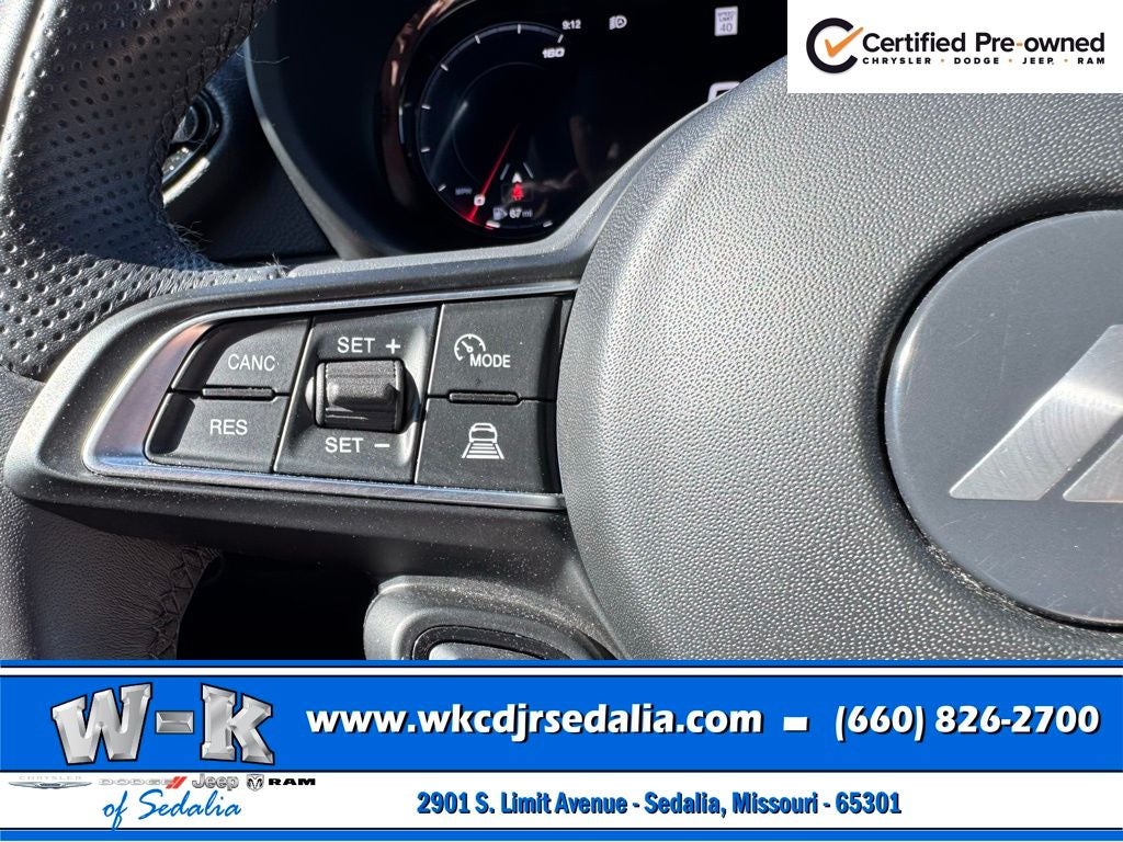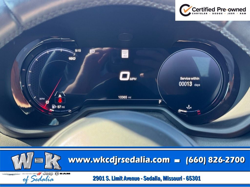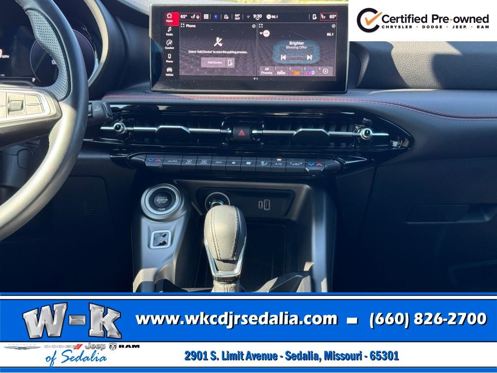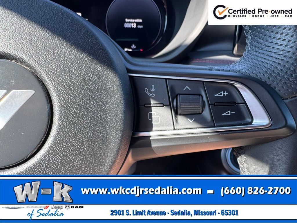 Certified Pre-Owned Gold Certified, Alcantara Seats w/Red Accents, Bright Pedals, Cold Weather Group, Dark GT Badge, Dark Hornet Badge, Dual Mode Suspension, Gloss Black Painted Day Light Opening, Gloss Black Painted Mirror Caps, GT Blacktop + Track Pack Bundle, Heated Front Seats, Heated Steering Wheel, Manual Adjust 6-Way Driver Seat, Manual Adjust 6-Way Front Passenger Seat, Quick Order Package 23M (DISC), Red Brake Calipers, Remote Start System, Sporty Leather Steering Wheel, Steel Door Sills, Wheels: 20 x 8 Abyss Finish Aluminum, 10.25 Touchscreen Display, 4-Wheel Disc Brakes, 6 Speakers, ABS brakes, Air Conditioning, Alloy wheels, AM/FM radio: SiriusXM, Anti-whiplash front head restraints, Apple CarPlay, Apple CarPlay/Android Auto, Auto High-beam Headlights, Brake assist, Bumpers: body-color, Cloth/Leatherette Seats, Compass, Connectivity - US/Canada, Delay-off headlights, Disassociated Touchscreen Display, Driver door bin, Driver vanity mirror, Dual front impact airbags, Dual front side impact airbags, Electronic Stability Control, Emergency communication system: Dodge Connect, Four wheel independent suspension, Front anti-roll bar, Front Bucket Seats, Front Center Armrest w/Storage, Front dual zone A/C, Front reading lights, Fully automatic headlights, Google Android Auto, GPS Antenna Input, Heated door mirrors, Illuminated entry, Integrated Center Stack Radio, Knee airbag, Lane Departure Warning System, Leather steering wheel, Low tire pressure warning, Manufacturer's Statement of Origin, Normal Duty Suspension, Occupant sensing airbag, Outside temperature display, Overhead airbag, Overhead console, Panic alarm, ParkView Rear Back-Up Camera, Passenger door bin, Passenger vanity mirror, Power door mirrors, Power steering, Power windows, Radio: Uconnect 5 w/10.25 Display, Rain sensing wipers, Rear anti-roll bar, Rear seat center armrest, Rear window defroster, Rear window wiper, Remote keyless entry, Security system, Speed control, Speed-sensing steering, Split folding rear seat, Spoiler, Tachometer, TBD Axle Ratio, Telescoping steering wheel, Tilt steering wheel, Traction control, Trip computer, Turn signal indicator mirrors, Variably intermittent wipers, Wheels: 17 x 7 Silver Aluminum, Alcantara Seats w/Red Accents, Bright Pedals, Cold Weather Group, Dark GT Badge, Dark Hornet Badge, Dual Mode Suspension, Gloss Black Painted Day Light Opening, Gloss Black Painted Mirror Caps, GT Blacktop + Track Pack Bundle, Heated Front Seats, Heated Steering Wheel, Manual Adjust 6-Way Driver Seat, Manual Adjust 6-Way Front Passenger Seat, Quick Order Package 23M (DISC), Red Brake Calipers, Remote Start System, Sporty Leather Steering Wheel, Steel Door Sills, Wheels: 20