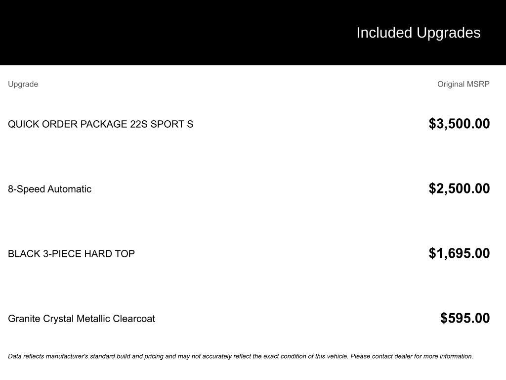 CPO Gold Warranty Certified, Advanced Brake Assist, Automatic Headlamps, Corning Gorilla Glass, Deep Tint Sunscreen Windows, Enhanced Adaptive Cruise Control, Front 1-Touch Down Power Windows, Full Speed Forward Collision Warning Plus, Power Heated Mirrors, Premium Wrapped Steering Wheel, Quick Order Package 22S Sport S, Radio: Uconnect 5 w/12.3 Display, Remote Keyless Entry, Security Alarm, Speed Sensitive Power Locks, Sport S, Sun Visors w/Illuminated Vanity Mirrors, Wheels: 17 x 7.5 Gray, 110 MPH Vehicle Max Speed Calibration, 3.45 Overall Top Gear Ratio, 4-Wheel Disc Brakes, 8 Speakers, ABS brakes, Air Conditioning, AM/FM radio, Apple CarPlay/Android Auto, Aux Battery, Black 3-Piece Hard Top, Brake assist, Cloth Low-Back Bucket Seats, Compass, Delay-off headlights, Driver door bin, Driver vanity mirror, Dual front impact airbags, Dual front side impact airbags, Electronic Stability Control, Freedom Panel Storage Bag, Front anti-roll bar, Front Bucket Seats, Front Center Armrest w/Storage, Front fog lights, Front reading lights, Integrated roll-over protection, Low tire pressure warning, No Soft Top, Non-Lock Fuel Cap w/o Discriminator, Normal Duty Suspension, Occupant sensing airbag, Outside temperature display, Overhead airbag, ParkView Rear Back-Up Camera, Passenger door bin, Passenger vanity mirror, Power steering, Radio data system, Rear anti-roll bar, Rear reading lights, Rear Window Defroster, Rear Window Wiper/Washer, Speed control, Split folding rear seat, Steering wheel mounted audio controls, Stop-Start Dual Battery System, Tachometer, Telescoping steering wheel, Tilt steering wheel, Traction control, Trip computer, Variably intermittent wipers, Wheels: 17 x 7.5 Black Steel Styled, Advanced Brake Assist, Automatic Headlamps, Corning Gorilla Glass, Deep Tint Sunscreen Windows, Enhanced Adaptive Cruise Control, Front 1-Touch Down Power Windows, Full Speed Forward Collision Warning Plus, Power Heated Mirrors, Premium Wrapped Steering Wheel, Quick Order Package 22S Sport S, Radio: Uconnect 5 w/12.3 Display, Remote Keyless Entry, Security Alarm, Speed Sensitive Power Locks, Sport S, Sun Visors w/Illuminated Vanity Mirrors, Wheels: 17 x 7.5 Gray.