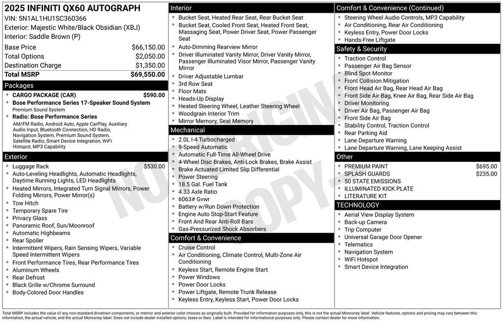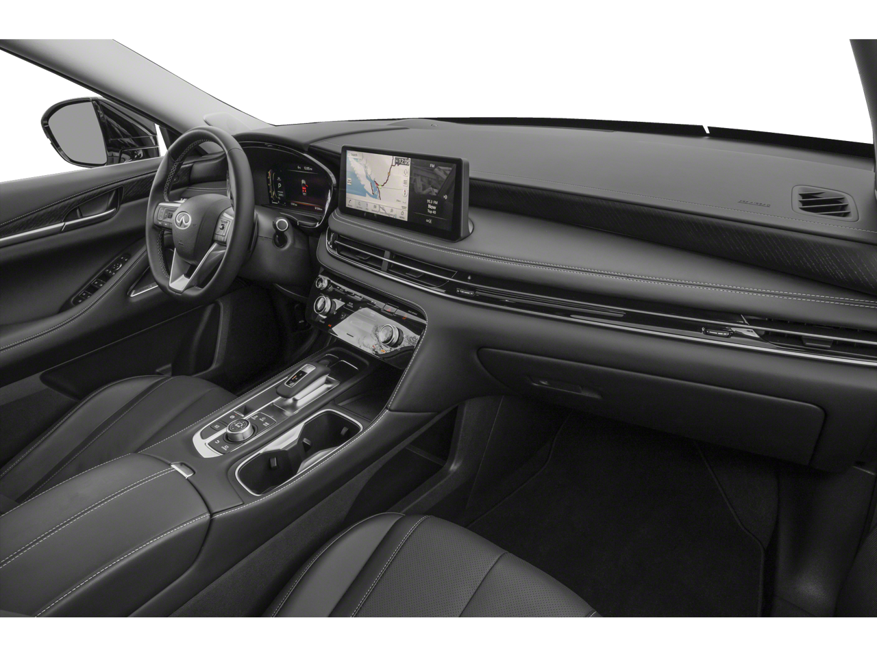 Cargo Package, Exterior Parking Camera Rear, Front dual zone A/C, Heads-Up Display, Heated front seats, Memory seat, Navigation system: INFINITI InTouch Navigation, Power driver seat, Power Liftgate, Power moonroof, Radio data system, Ventilated front seats, 17 Speakers, 3rd row seats: bench, 4-Wheel Disc Brakes, ABS brakes, Air Conditioning, Alloy wheels, AM/FM radio: SiriusXM, Auto High-beam Headlights, Auto tilt-away steering wheel, Auto-dimming door mirrors, Auto-dimming Rear-View mirror, Automatic temperature control, Brake assist, Delay-off headlights, Driver door bin, Driver vanity mirror, Dual front impact airbags, Dual front side impact airbags, Electronic Stability Control, Four wheel independent suspension, Front anti-roll bar, Front Bucket Seats, Front reading lights, Fully automatic headlights, Garage door transmitter: HomeLink, Heated door mirrors, Heated rear seats, Heated steering wheel, Illuminated entry, Knee airbag, Leather Shift Knob, Leather steering wheel, Low tire pressure warning, Occupant sensing airbag, Outside temperature display, Overhead airbag, Overhead console, Panic alarm, Passenger door bin, Passenger vanity mirror, Power door mirrors, Power passenger seat, Power steering, Power windows, Rain sensing wipers, Rear air conditioning, Rear anti-roll bar, Rear reading lights, Rear side impact airbag, Rear window defroster, Rear window wiper, Reclining 3rd row seat, Remote keyless entry, Security system, Speed control, Speed-sensing steering, Speed-Sensitive Wipers, Split folding rear seat, Spoiler, Steering wheel memory, Steering wheel mounted audio controls, Tachometer, Telescoping steering wheel, Tilt steering wheel, Traction control, Trip computer, Turn signal indicator mirrors, Variably intermittent wipers, Cargo Package, Exterior Parking Camera Rear, Front dual zone A/C, Heads-Up Display, Heated front seats, Memory seat, Navigation system: INFINITI InTouch Navigation, Power driver seat, Power Liftgate, Power moonroof, Radio data system, Ventilated front seats.